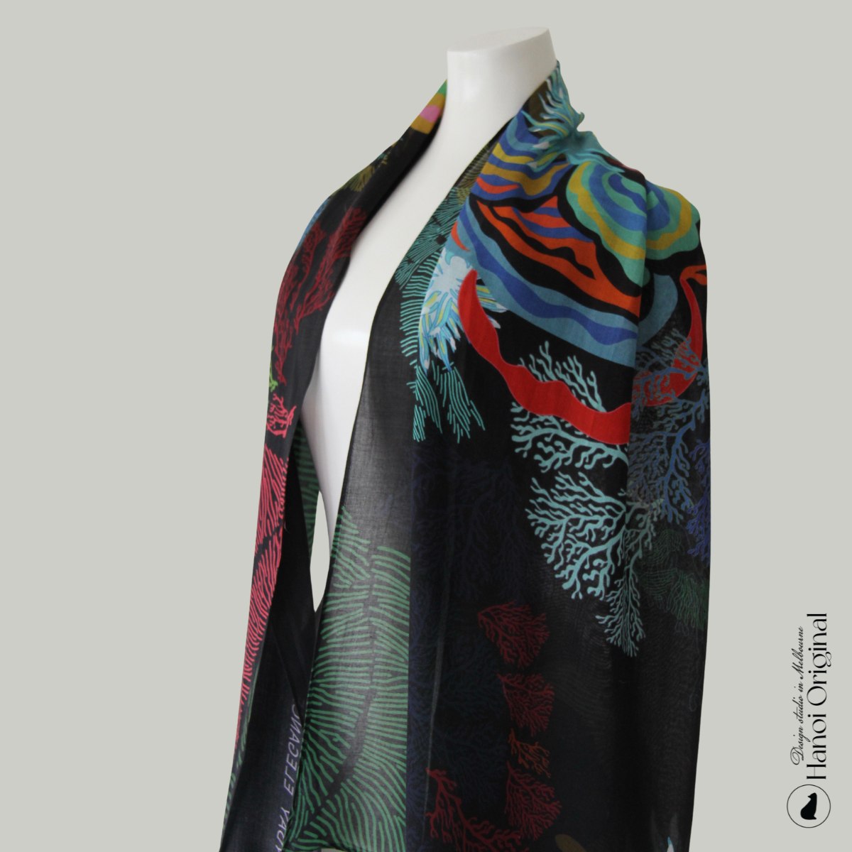 This modal cashmere scarf features vivid coral and floral motifs glowing against a rich midnight backdrop, inspired by the reefs of Phu Quoc. Feather-light yet luxuriously soft, the scarf is perfect for summer evenings and a versatile accessory for layering across all seasons.